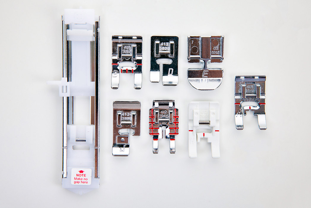 Tillbehören som ingår: A standardfot, B mönstersömsfot, C knapphålsskena, D fållsömsfot, E blixtlåsfot, H glidfot, J kantsömsfot, ¼ inch quiltfot, Linjalmått, Skruvmejsel, Nålar, Spolar 4st